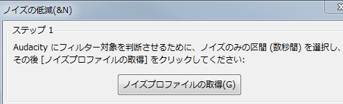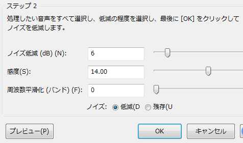 もし、その音に数秒のノイズプロファイルがない場合は別の音からノイズプロファイルを取るという方法もあります(もちろん、できれば同じ音から取ったほうが良い)。手持ちが無い場合は、こちらのサンプルノイズをご自由に使って下さい。 ステップ 2 調整