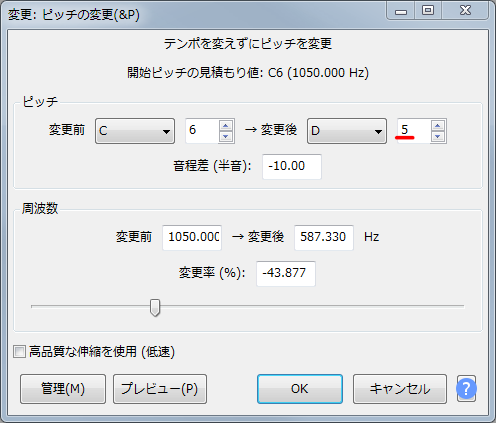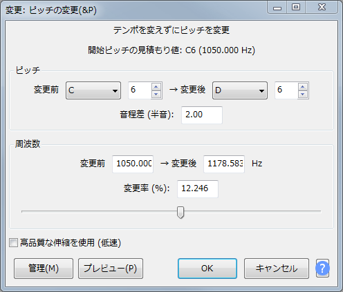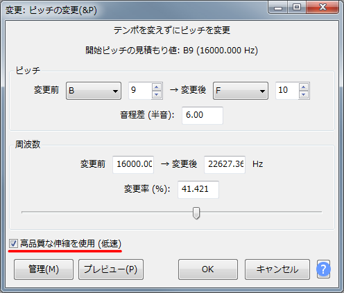 高品質な伸縮を使用(低速)にチェックを入れた場合のサンプル音(音程差+6の例)