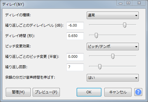 ディレイ時間 (秒) というのは、エコーする間隔の時間のことです。元音の長さに合わせて調整して下さい。