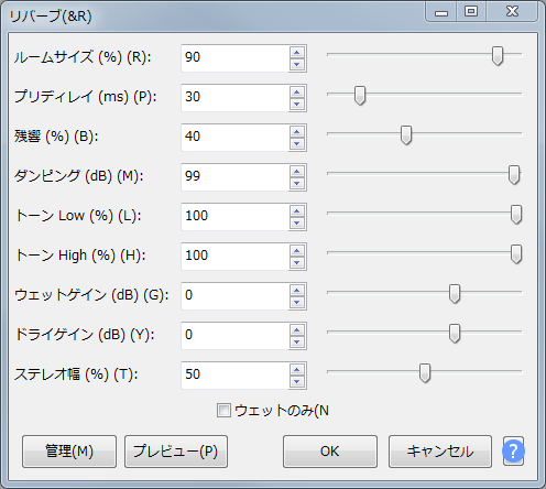 下に『ウェットのみ』というチェックボックスがあります。これにチェックをいれると、元音が完全に消され、反響音のみになります。