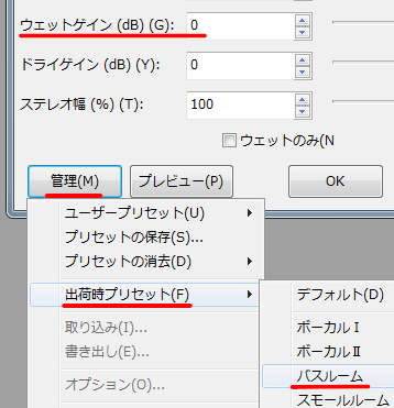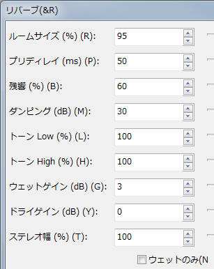 そのままでもいいが、ちょっと響きの強さを付けるため、ウェットゲインを -6dBから0dBまで上げる。