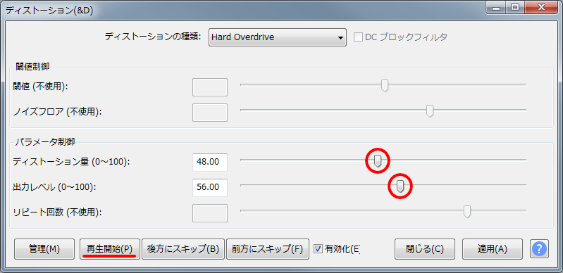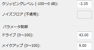 たくさん切り取れば切り取るほど、音が壊れていきます。 ・ドライブ これはクリッピングされる前に音全体の音圧を上げます。やってみた感じ、100で+6dB、50で+3dBみたいです。上のクリッピングレベルで音を切り取るというか削る訳ですが、そうすると音は音割れするものの弱々しくなります。削られない部分の音圧を上げることで全体の音の力を増させます。