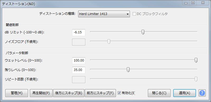 実際のエフェクトのかけ方 ![]() Hard Limiterはリアルタイムプレビューが可能です。まずエフェクトを掛ける部分を選択します。次に『再生開始』ボタンで音声を再生。そして音を聴きながらスライダを自由に動かし調整します。良い感じになったら『適用』して下さい。