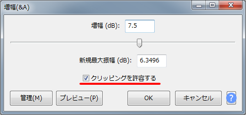 「増幅」の「クリッピングを許可する」にチェックを入れて、7.5dB 音を上げて下さい。(7.5dBはこの音の場合です。音によって数値は好きに変えて下さい!) |