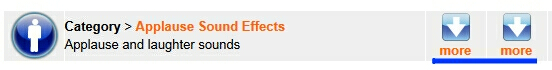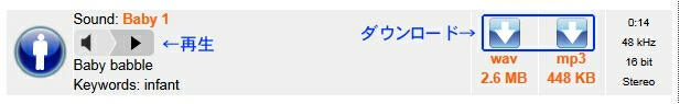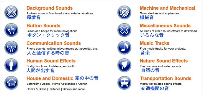 ![]() http://www.soundjay.com/ 効果音数800以上/WAV MP3 配られている効果音のレベルは高いです。WAVとMP3の両方があり、用途に応じて使い分けることができます。効果音を使用する際は著作表示は絶対ではないのですが、音楽(Music Tracks)を使用する際は必ずwww.SoundJay.comという著作表示を付けて下さい。 ![]() 絵で分かりやすく分類されています。 ![]() 左が再生。右の↓矢印がWAVとMP3のダウンロードです。WAV=高音質、MP3=ファイルサイズが軽い ![]() Categoryとは分類のこと。moreをクリックして進めば分類に応じた効果音が現れます。 気づきにくいですが、HOMEに戻るボタンは各ページの右上にあります。