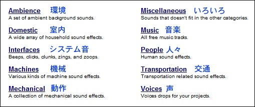 ![]() http://www.pacdv.com/sounds/ 効果音数900以上/WAVもしくはMP3 ここも良い音がたくさんあり、すばらしいサイトです。 ![]() きちんと分類されてます。 ![]() 左の三角で再生。保存する場合は青色のファイル名を右クリックして保存。